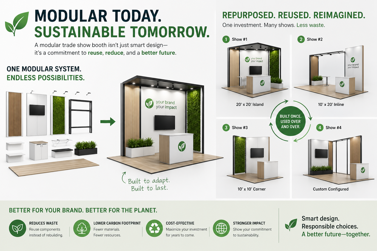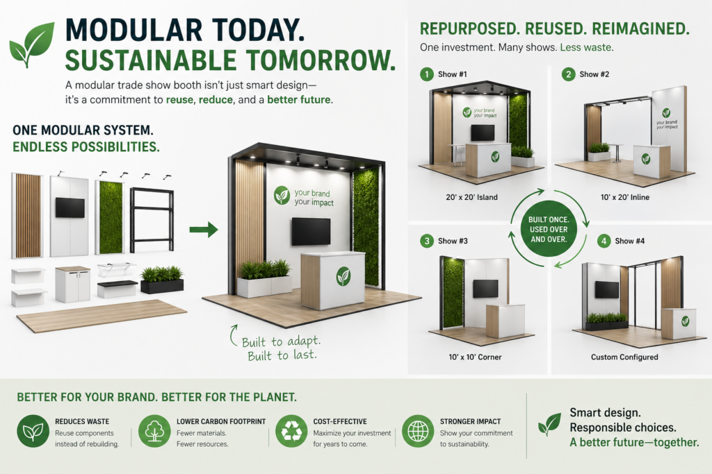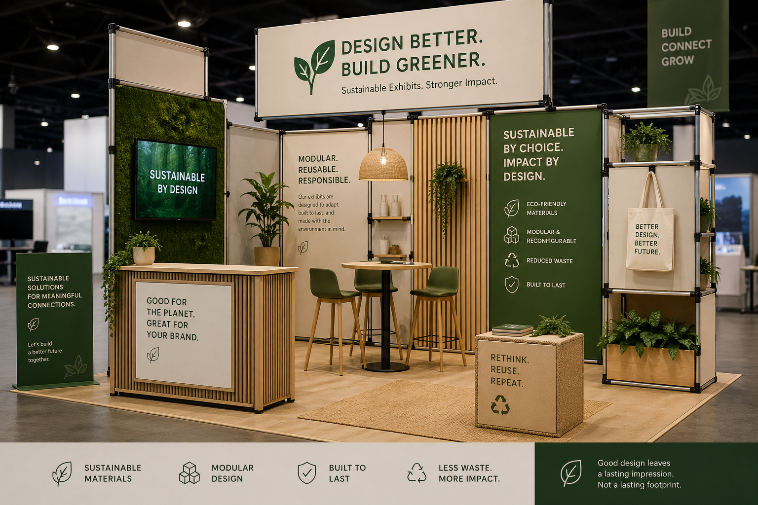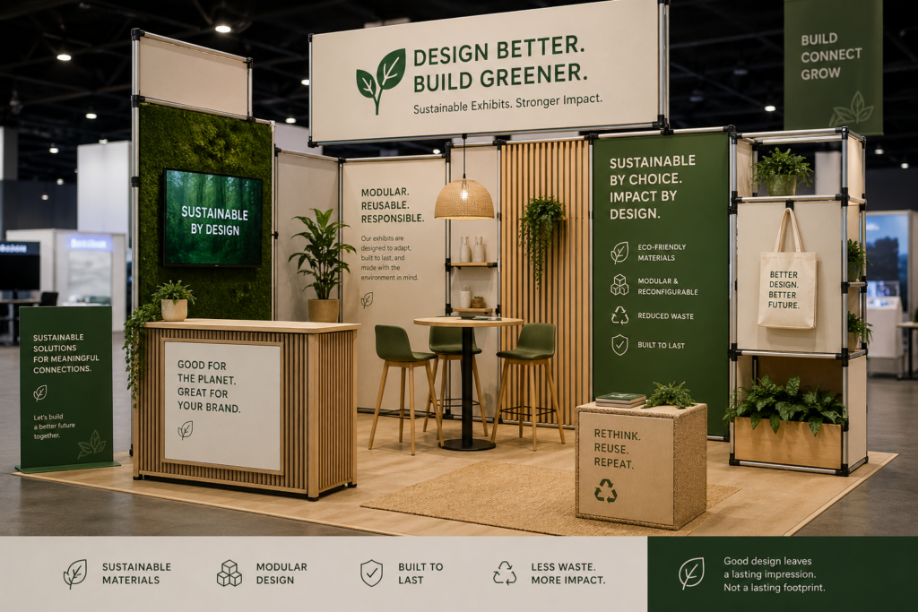 Eco-friendly exhibit materials include renewable resources like bamboo, reclaimed wood and cork, alongside recycled options such as aluminum extrusion, FSC-certified plywood, and recycled plastics are widely available. And most of the time there’s no visual tradeoff. Your booth still looks like a premium brand experience. The real win is combining smart materials with a system designed to last.
